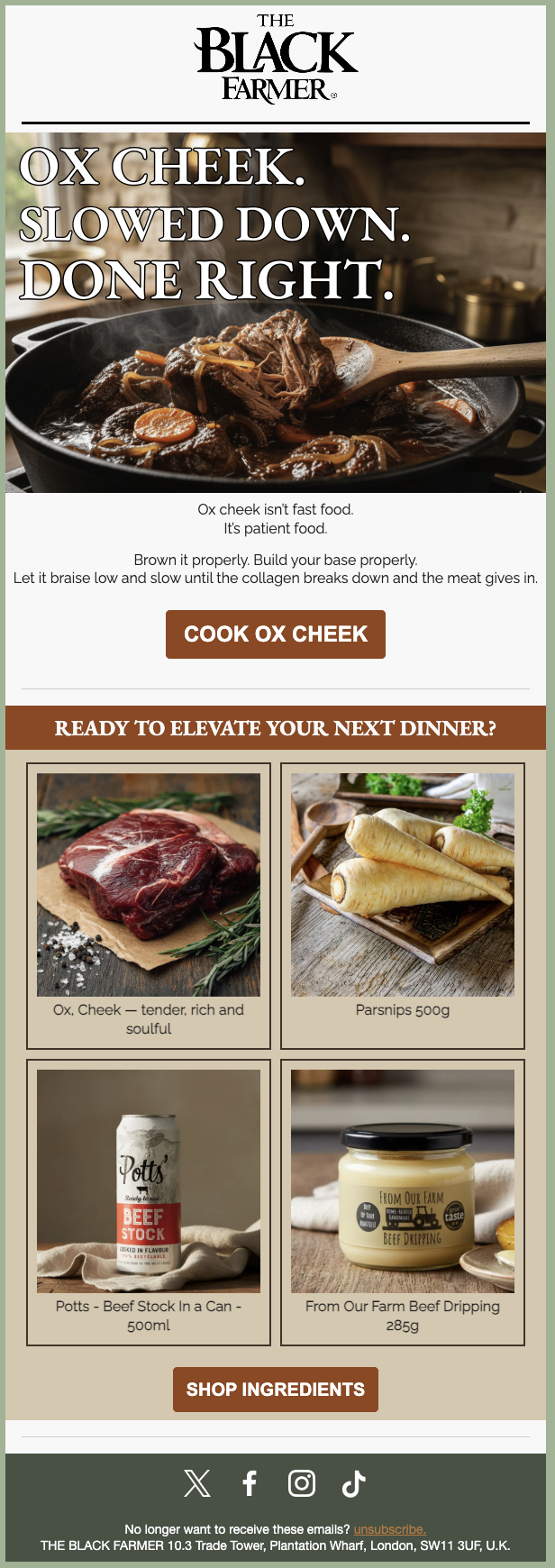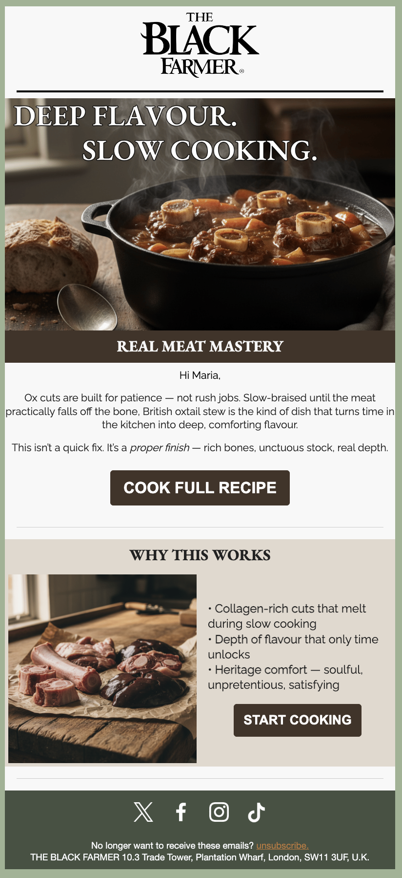 Sent to customers after purchase to provide recipe ideas and cooking inspiration, building brand affinity and encouraging repeat engagement.