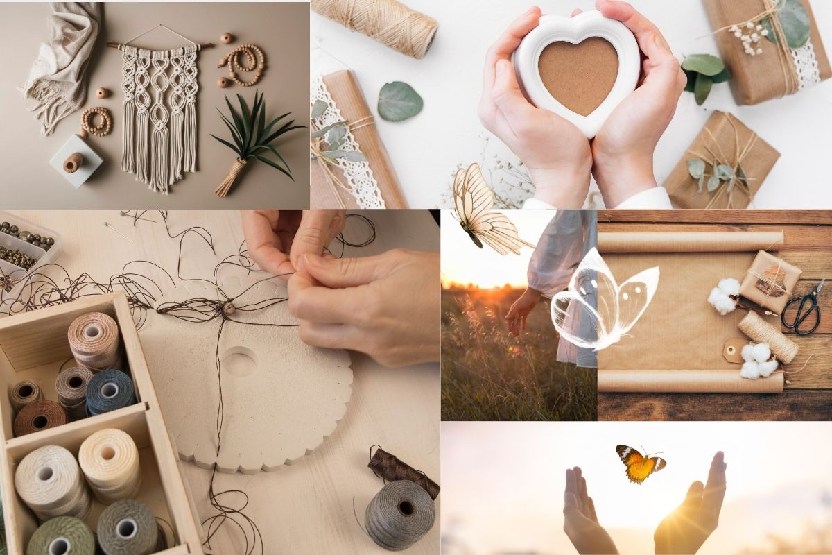 The colour palette draws from earth and raw material — warm terracotta tones, deep charcoal, and soft neutrals that evoke authenticity, texture, and handmade craft.